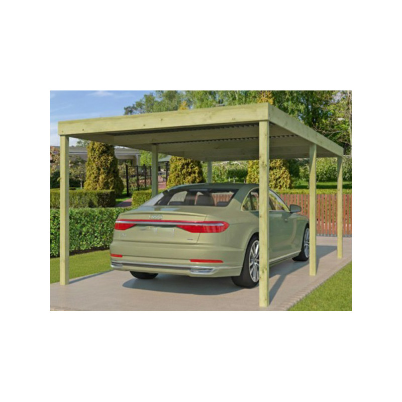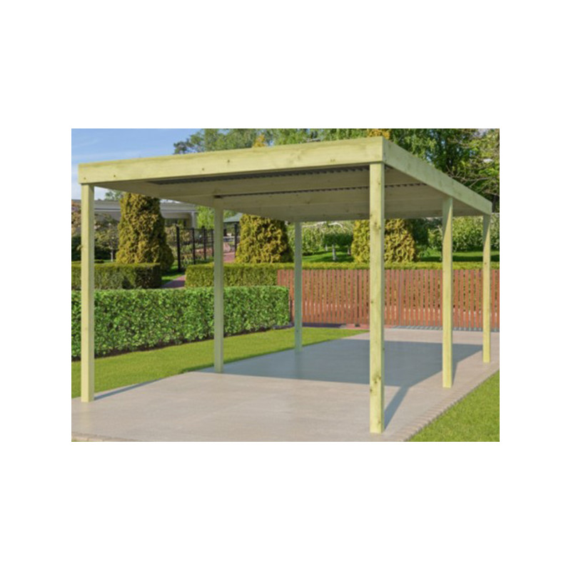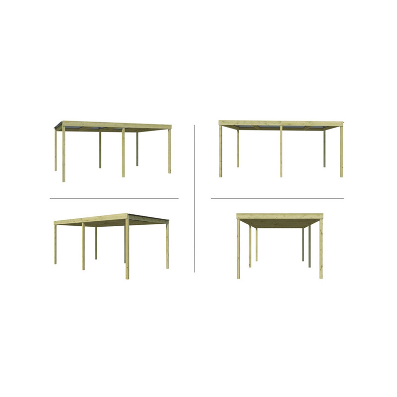 Dimension hors tout : L 307 x P 552 x Ht 229 cm Surface hors tout : 16.95 m² Hauteur de Passage : 207 cm Largeur de Passage : 280 cm Matière : Pin certifié FSC, autoclave Couleur : Naturel Pieds : 6 poteaux 90 x 90 mm Option : Platines d'ancrage Toiture : Toit plat - Chevrons Couverture : Plaques ondulées en fibre de verre Inclus : Visserie de montage...