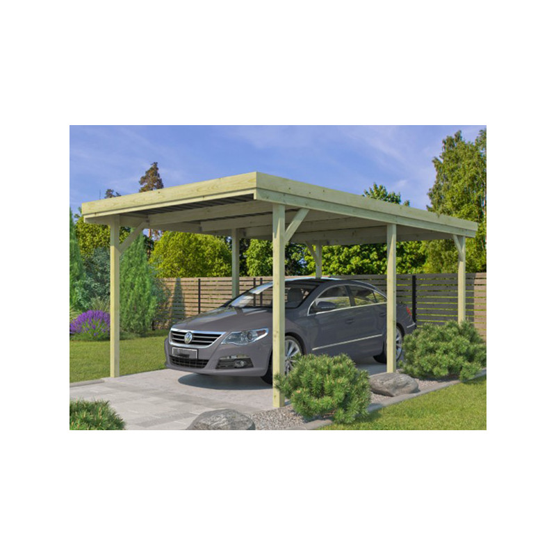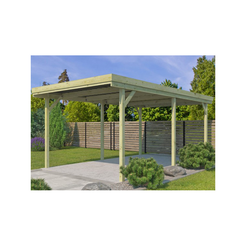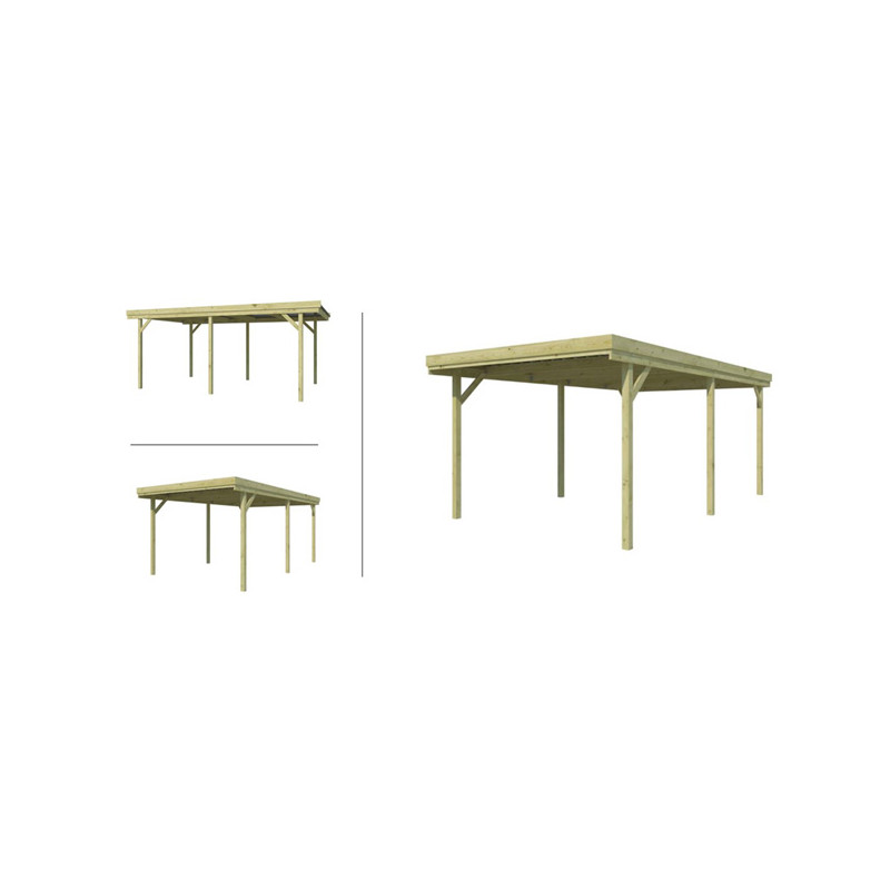 Dimension hors tout : L 302 x P 502 x Ht 227 cm Surface hors tout : 15.16 m² Hauteur de Passage : 204 cm Largeur de Passage : 280 cm Matière : Pin certifié FSC, autoclave Couleur : Naturel Pieds : 6 poteaux 90 x 90 mm Option : Platines d'ancrage Toiture : Toit plat - Chevrons Couverture : Plaques ondulées en fibre de verre Inclus : Visserie de montage...
