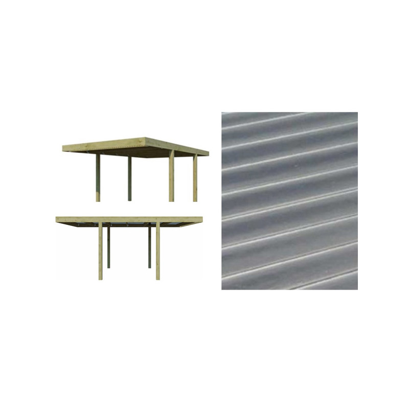 Dimensions hors tout : L 311 x P 552 x Ht 229 cm Surface hors tout : 17.17 m² Hauteur de passage : 204 cm Largeur de passage : 274 cm Matière : Pin traité certifié FSC Traitement : Imprégnation sous pression Poteaux : 4 Pieds 120x120 mm + Arcs Option : Sabots d'ancrage Toiture : Toit plat, poutres et traverses Couverture : Panneaux fibre de verre Inclus...