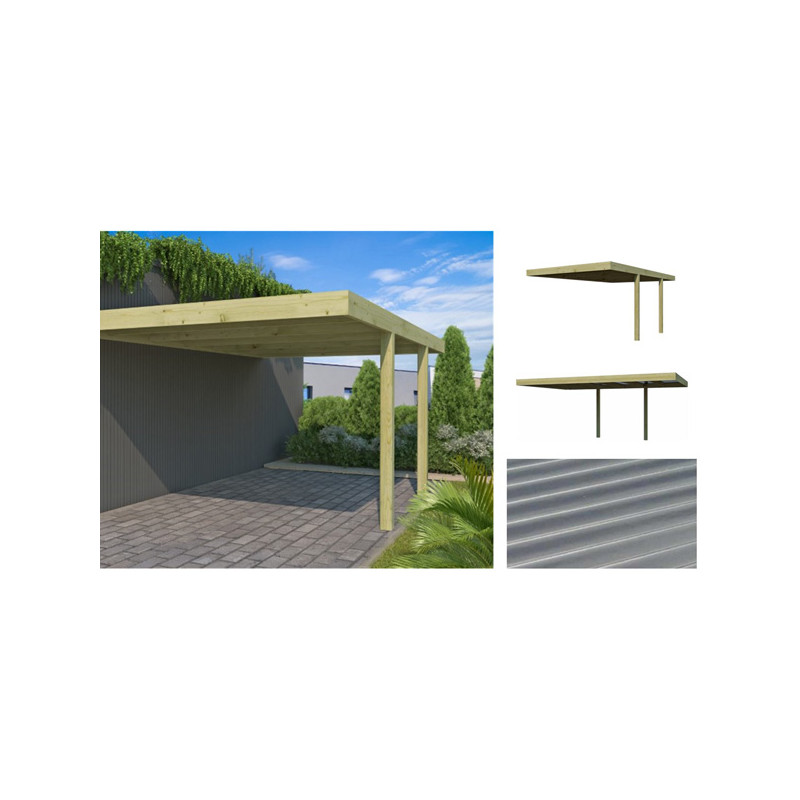 Dimension hors tout : L602 x P512 x Ht269 cm Surface utile : 29.90 m² Hauteur de Passage : 214 / 234 cm Largeur de Passage : 586 cm Matière : Pin sylvestre , autoclave 3 poteaux : 12 x 12 cm Toiture : Toit plat Couverture : Polycarbonate gris, 0.8 mm Inclus : Visserie de montage Option : Platines d'ancrage au sol Garantie : 3 ans