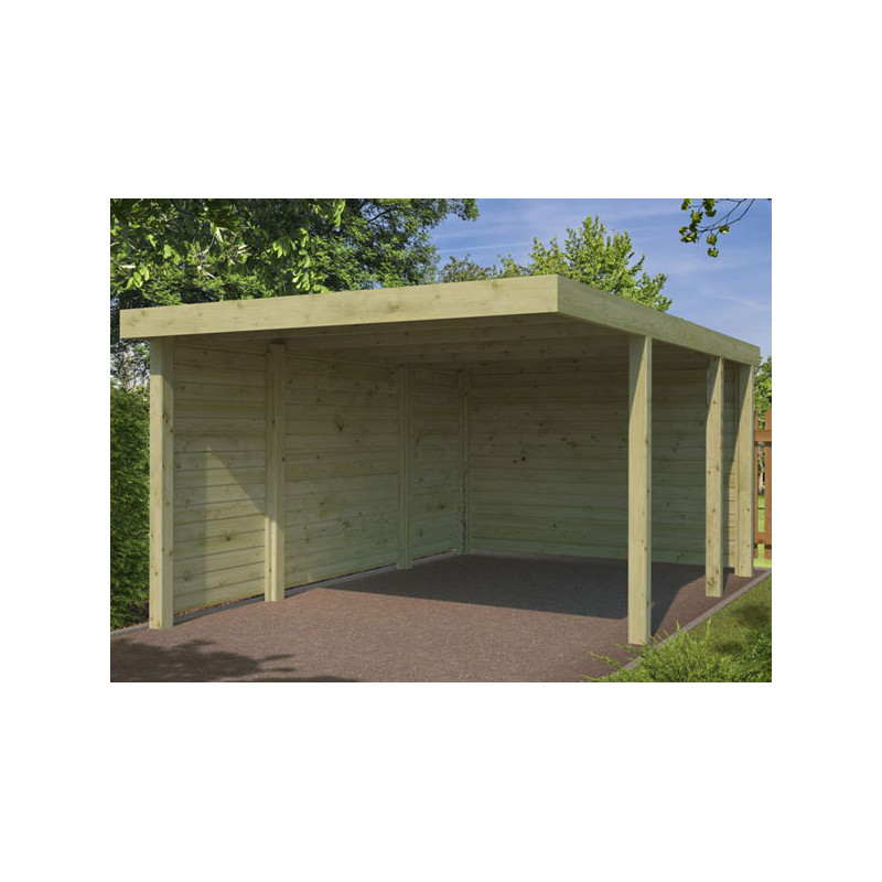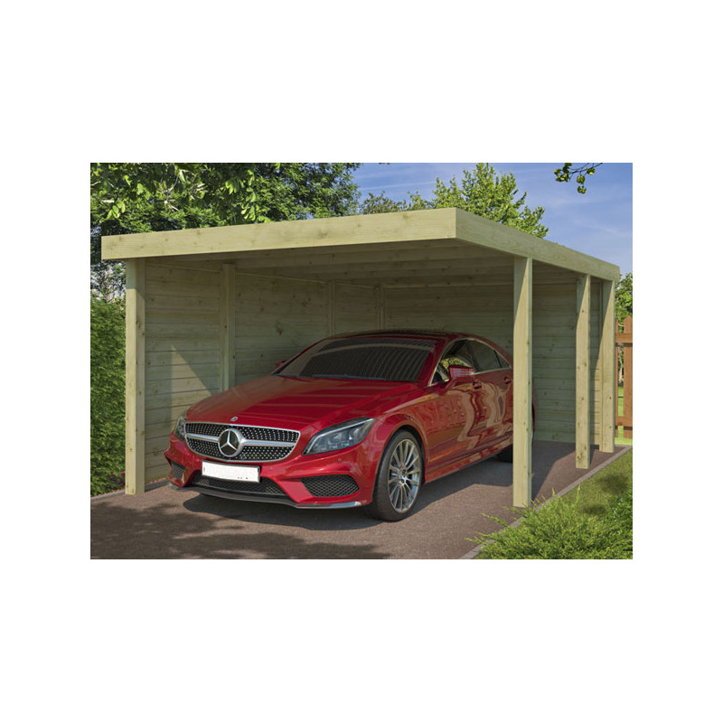 Dimension hors tout : L 307 x P 552 x Ht 229 cm Surface hors tout : 16.95 m² Hauteur de Passage : 207 cm Largeur de Passage : 280 cm Matière : Pin certifié FSC, autoclave Couleur : Naturel Pieds : 6 poteaux 90 x 90 mm Option : Platines d'ancrage Toiture : Toit plat - Chevrons Couverture : Plaques ondulées en fibre de verre Inclus : Visserie de montage...