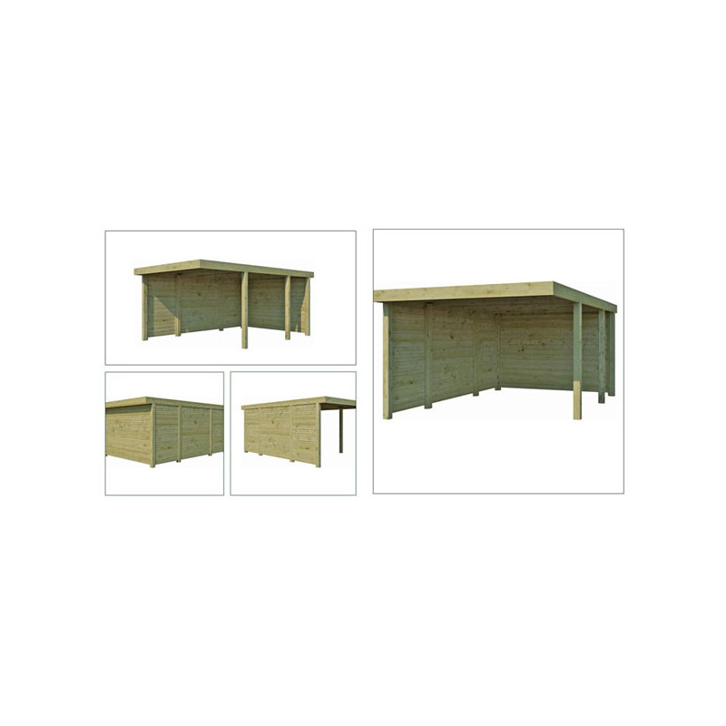 Dimension hors tout : L 311 x P 720 x Ht 229 cm Surface utile : 19.77 m² Surface Carport : 14.99 m² Surface Atelier : 4.78 m² Hauteur de Passage : 204 cm Largeur de Passage : 274 cm Matière : Pin, autoclave Couleur : Naturel Pieds : 8 poteaux 120x120 mm + 1 90x90 Ancrage : Sabots en option Toiture : Toit plat + Panneaux polyester Cloisons : Pin massif de...