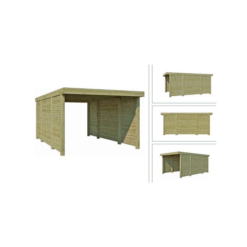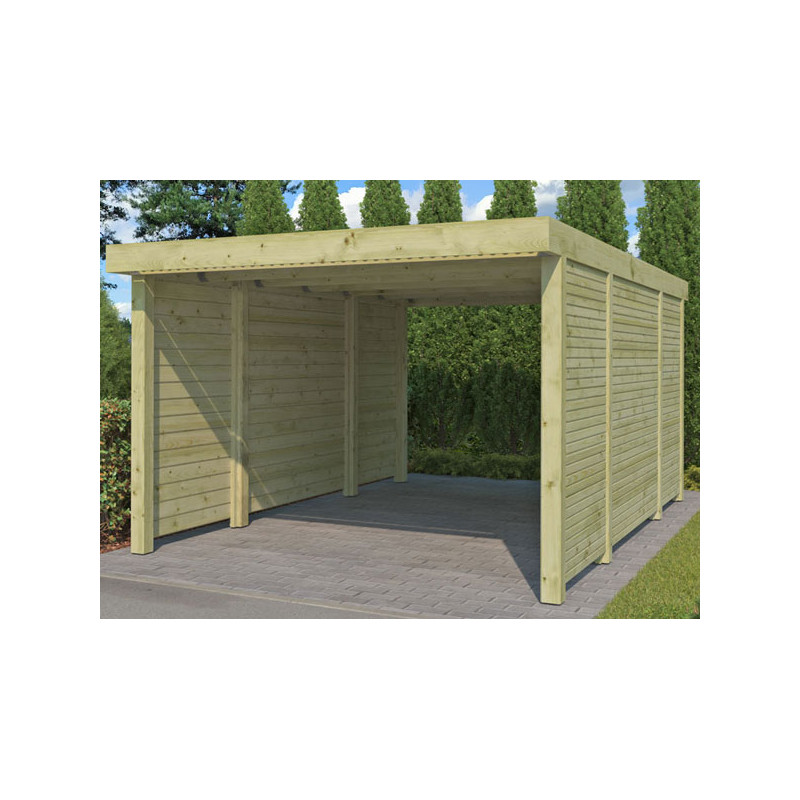 Dimension hors tout : L 307 x P 552 x Ht 229 cm Surface hors tout : 16.95 m² Hauteur de Passage : 207 cm Largeur de Passage : 280 cm Matière : Pin certifié FSC, autoclave Couleur : Naturel Pieds : 6 poteaux 90 x 90 mm Option : Platines d'ancrage Toiture : Toit plat - Chevrons Couverture : Plaques ondulées en fibre de verre Inclus : Visserie de montage...
