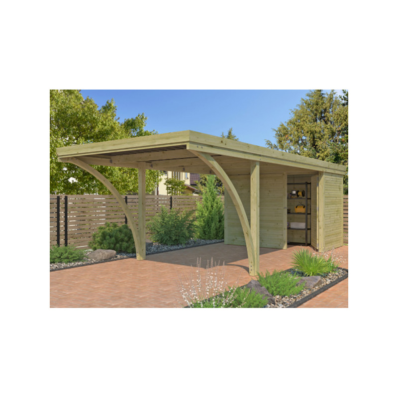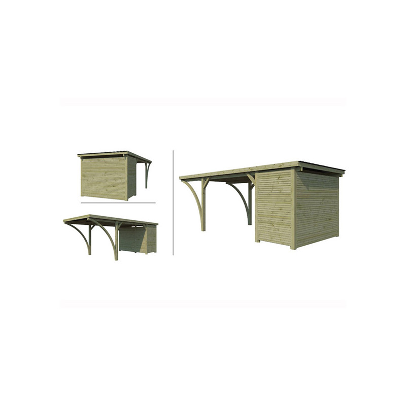 Dimension hors tout : L 307 x P 552 x Ht 229 cm Surface hors tout : 16.95 m² Hauteur de Passage : 207 cm Largeur de Passage : 280 cm Matière : Pin certifié FSC, autoclave Couleur : Naturel Pieds : 6 poteaux 90 x 90 mm Option : Platines d'ancrage Toiture : Toit plat - Chevrons Couverture : Plaques ondulées en fibre de verre Inclus : Visserie de montage...