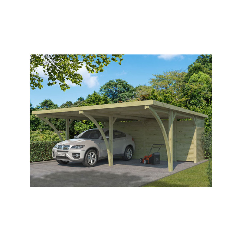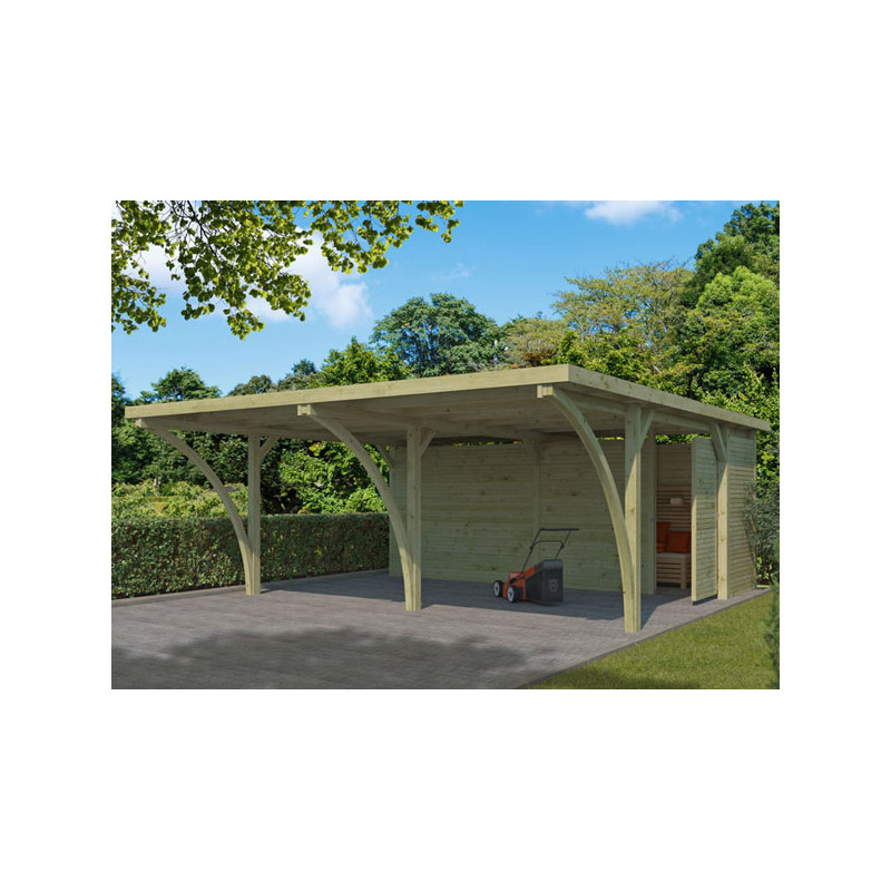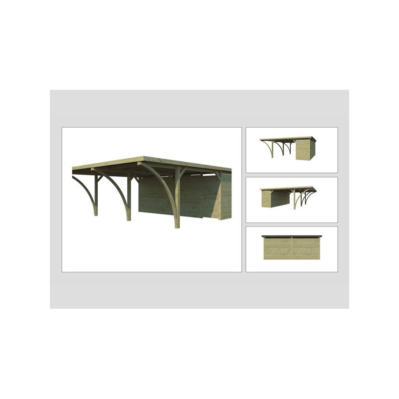 Dimension hors tout : L 311 x P 720 x Ht 229 cm Surface utile : 19.77 m² Surface Carport : 14.99 m² Surface Atelier : 4.78 m² Hauteur de Passage : 204 cm Largeur de Passage : 274 cm Matière : Pin, autoclave Couleur : Naturel Pieds : 6 poteaux 120x120 mm + 2 arcs + 1 90x90 Ancrage : Sabots en option Toiture : Toit plat + Panneaux polyester Cloisons : Pin...